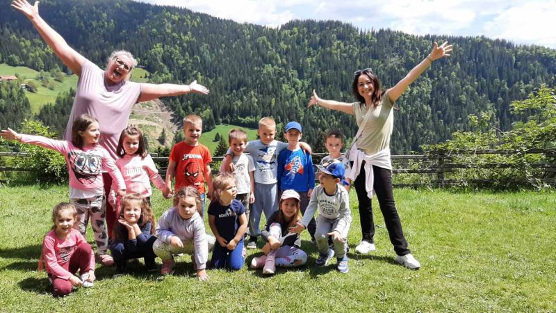 otroci in spremljevalke iz skupin Sovice in Žverce pošiljajo sončne pozdrave iz prekrasne narave v okolici Luč.