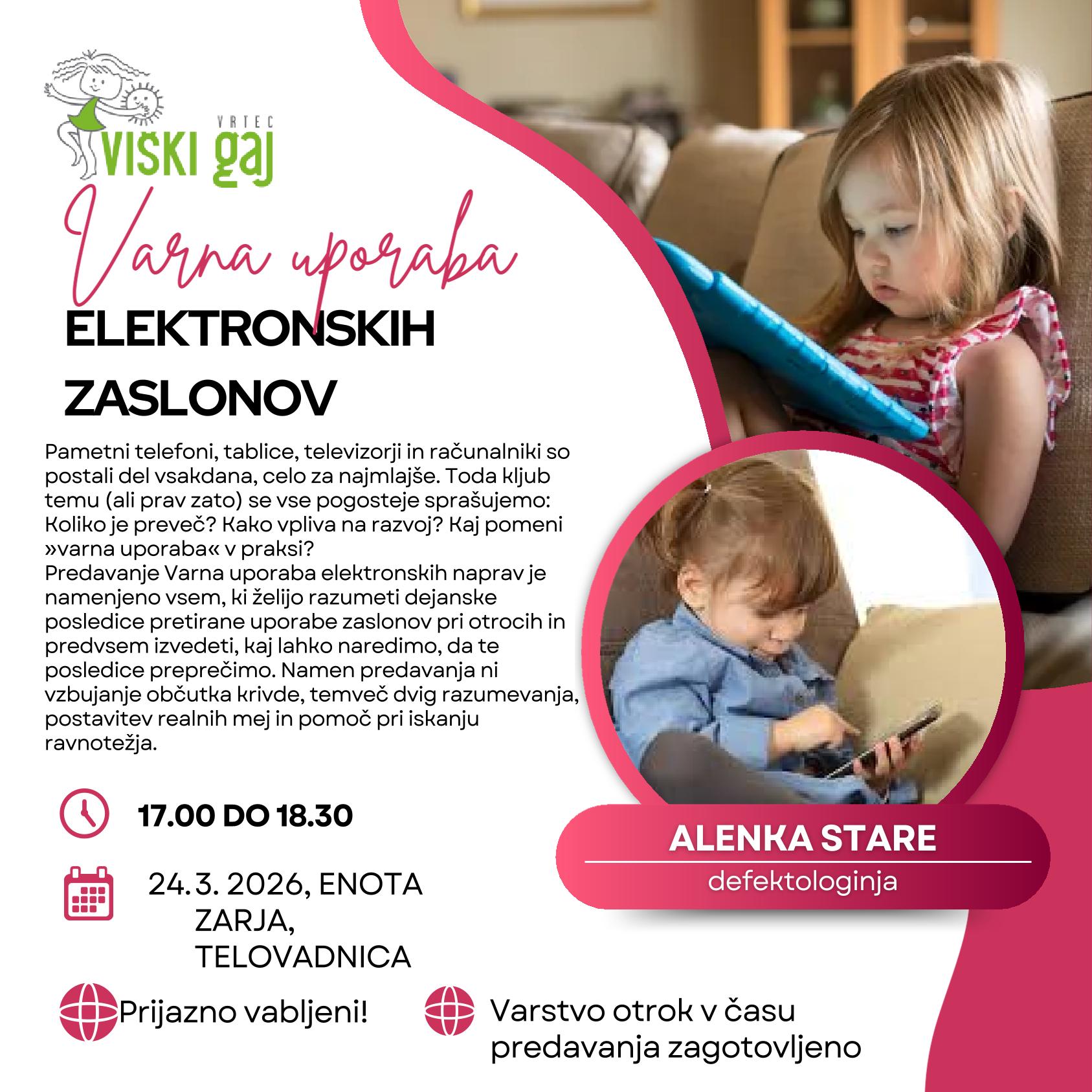 Predavanje Varna uporaba elektronskih naprav je namenjeno vsem, ki želijo razumeti dejanske posledice pretirane uporabe zaslonov pri otrocih in predvsem izvedeti, kaj lahko naredimo, da te posledice preprečimo. Namen predavanja ni vzbujanje občutka krivde, temveč dvig razumevanja, postavitev realnih mej in pomoč pri iskanju ravnotežja.